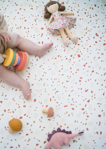 The beautiful terrazzo design of this playmat is an epitome of perfection. Created with expertise and passion, the pattern was designed by a talented surface designer from the UK and meticulously evaluated by a renowned Creative Consultant from London who continues to create exceptional products for many international interior and fashion brands.